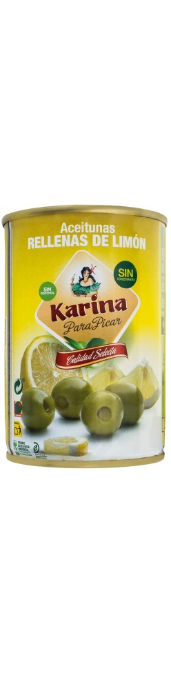 Składniki: Zielone oliwki Manzanilla bez pestek, cytryna 6% (cytryna, emulgator: alginian sodu), woda, sól, wzmacniacz smaku: glutaminian sodu, guanylan disodowy, inozynian disodowy, przeciwutleniacz: kwas cytrynowy, kwas askorbinowy. Przechowywać w miejscu chłodnym i suchym. Najlepiej spożyć przed końcem daty drukowanej na opakowaniu. Po otwarciu przechowywać w warunkach chłodniczych nie dłużej niż 4 dni. Waga netto 295g, po odsączeniu 120g. Wyprodukowano w Hiszpanii.
