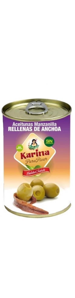 Składniki: Zielone oliwki Manzanilla bez pestek, anchois 6% (anchois, emulgator: alginian sodu), woda, sól, wzmacniacz smaku: glutaminian sodu, guanylan disodowy, inozynian disodowy, konserwant: sorbinian potasu, kwas mlekowy, przeciwutleniacz: kwas cytrynowy, kwas askorbinowy. Przechowywać w miejscu chłodnym i suchym. Najlepiej spożyć przed końcem daty drukowanej na opakowaniu. Po otwarciu przechowywać w warunkach chłodniczych nie dłużej niż 4 dni. Waga netto 295g, po odsączeniu 120g. Wyprodukowano w Hiszpanii.