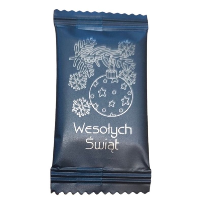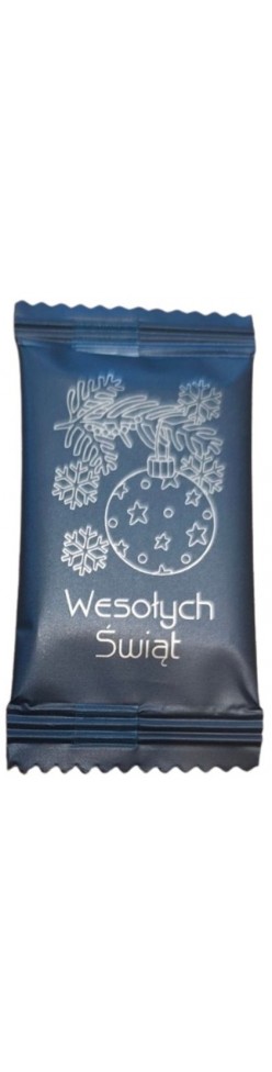 - Eleganckie Opakowanie: Czekoladka zapakowana jest w folię w kolorze ciemno zielonym ozdobioną złotym motywem choinkowej bombki i płatków śniegu, z napisem "Wesołych Świąt".